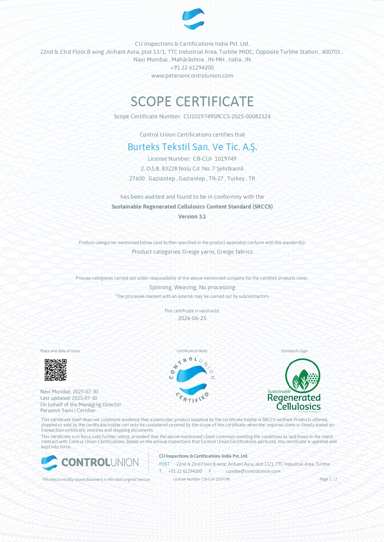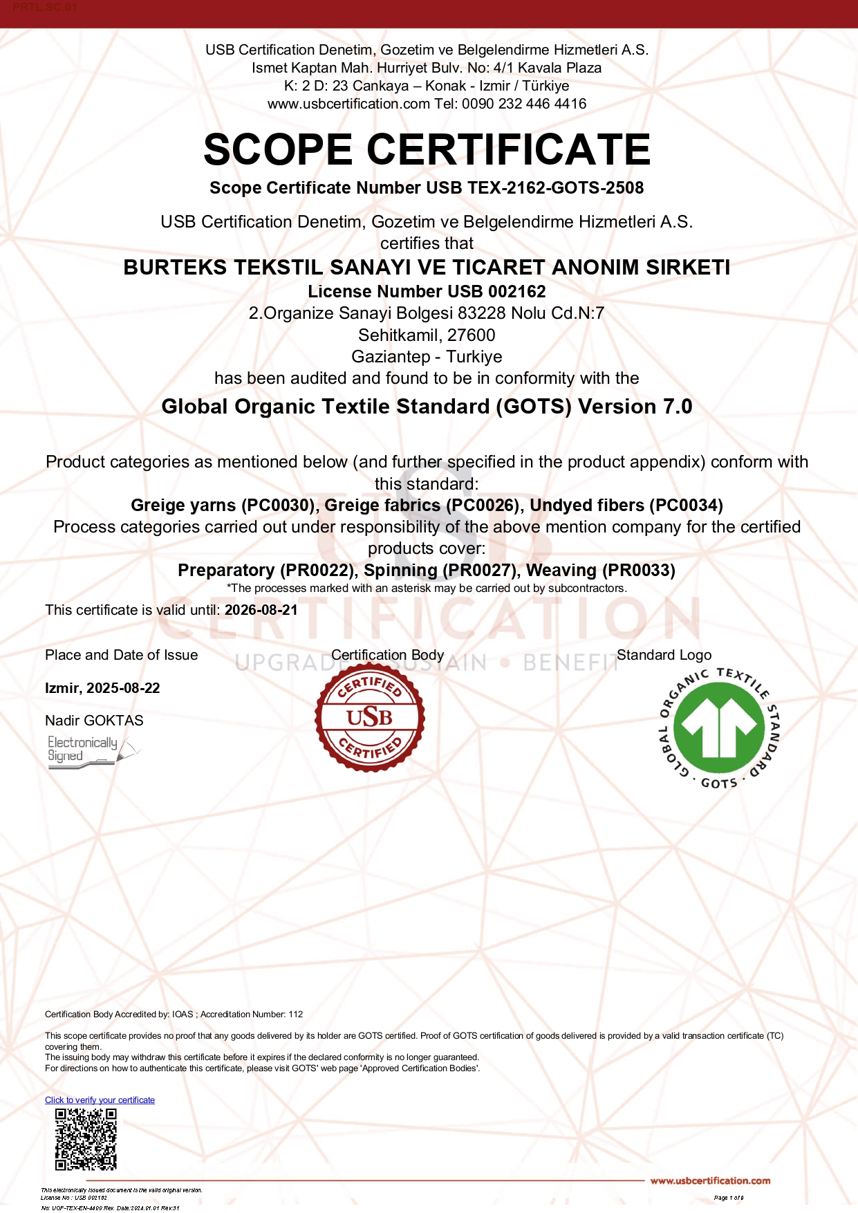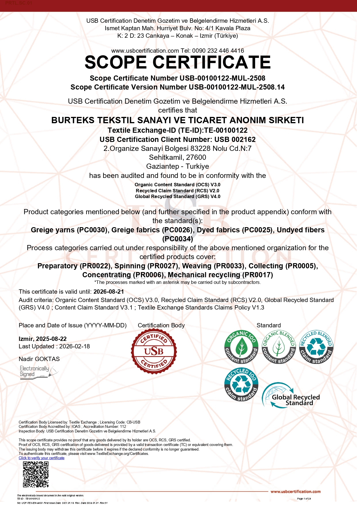 Burteks Tekstil has aligned itself with numerous international certifications and standards to document its sustainability efforts and demonstrate its commitment in this area. With the certifications that highlight their quality, the company proves that its production processes are sensitive to environmental and human health.