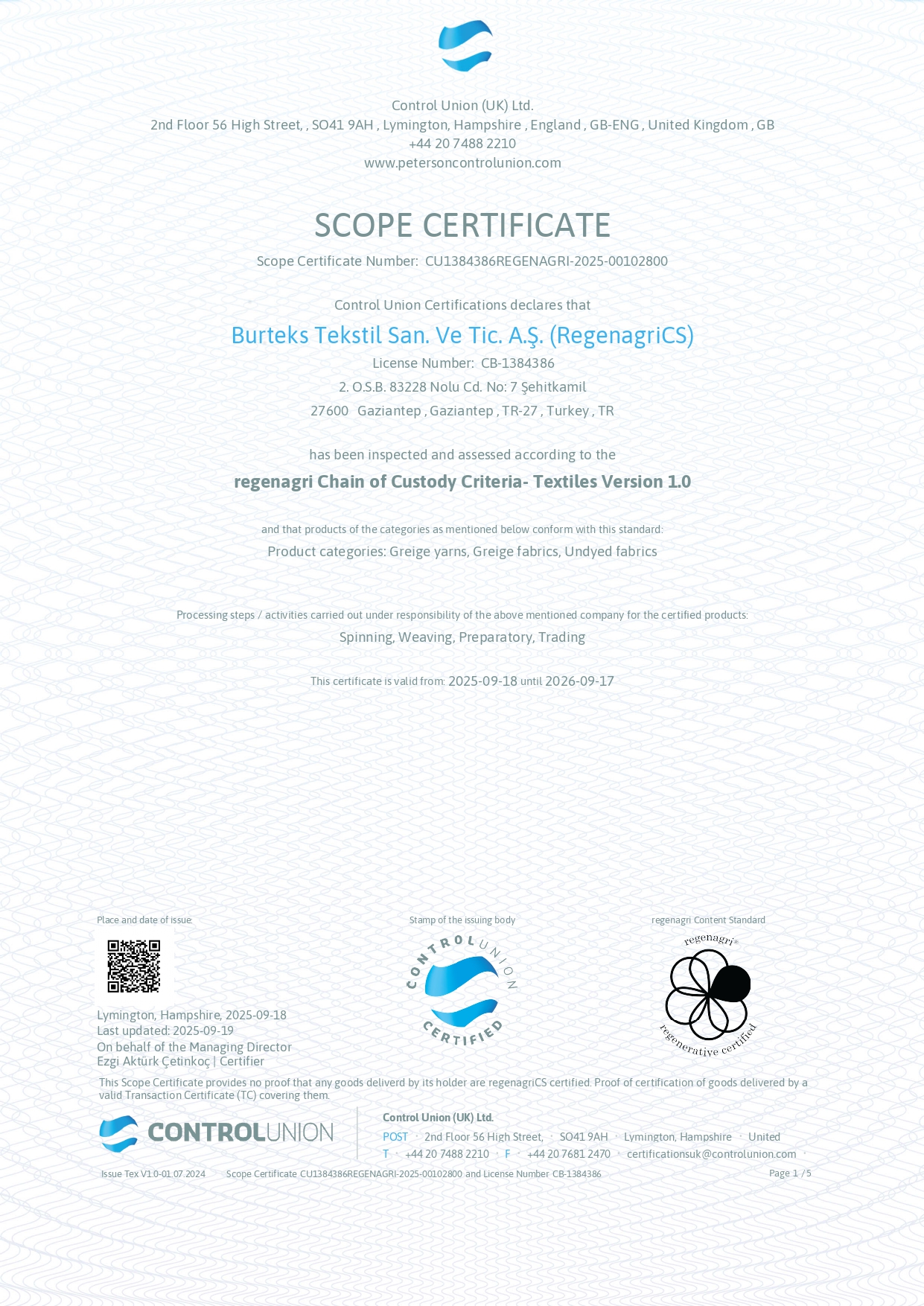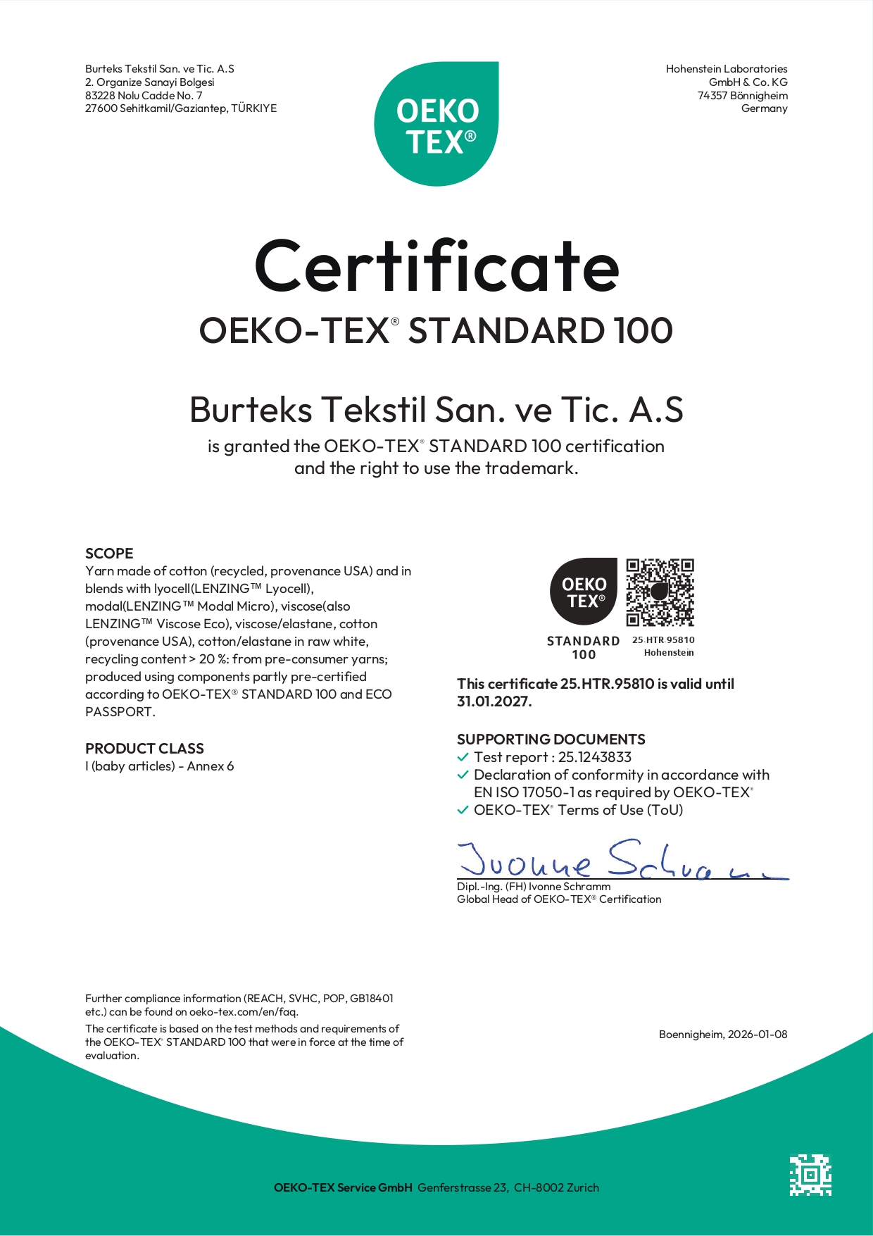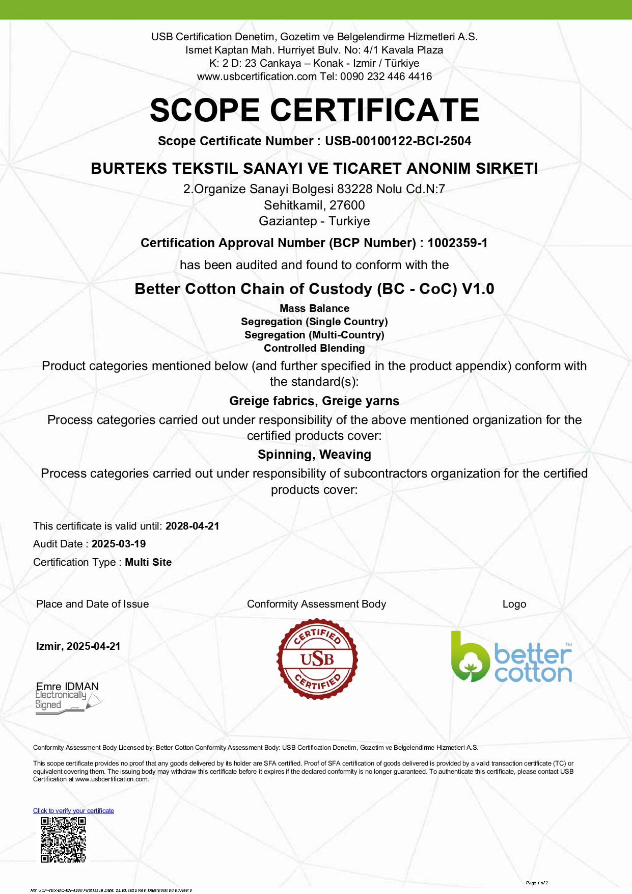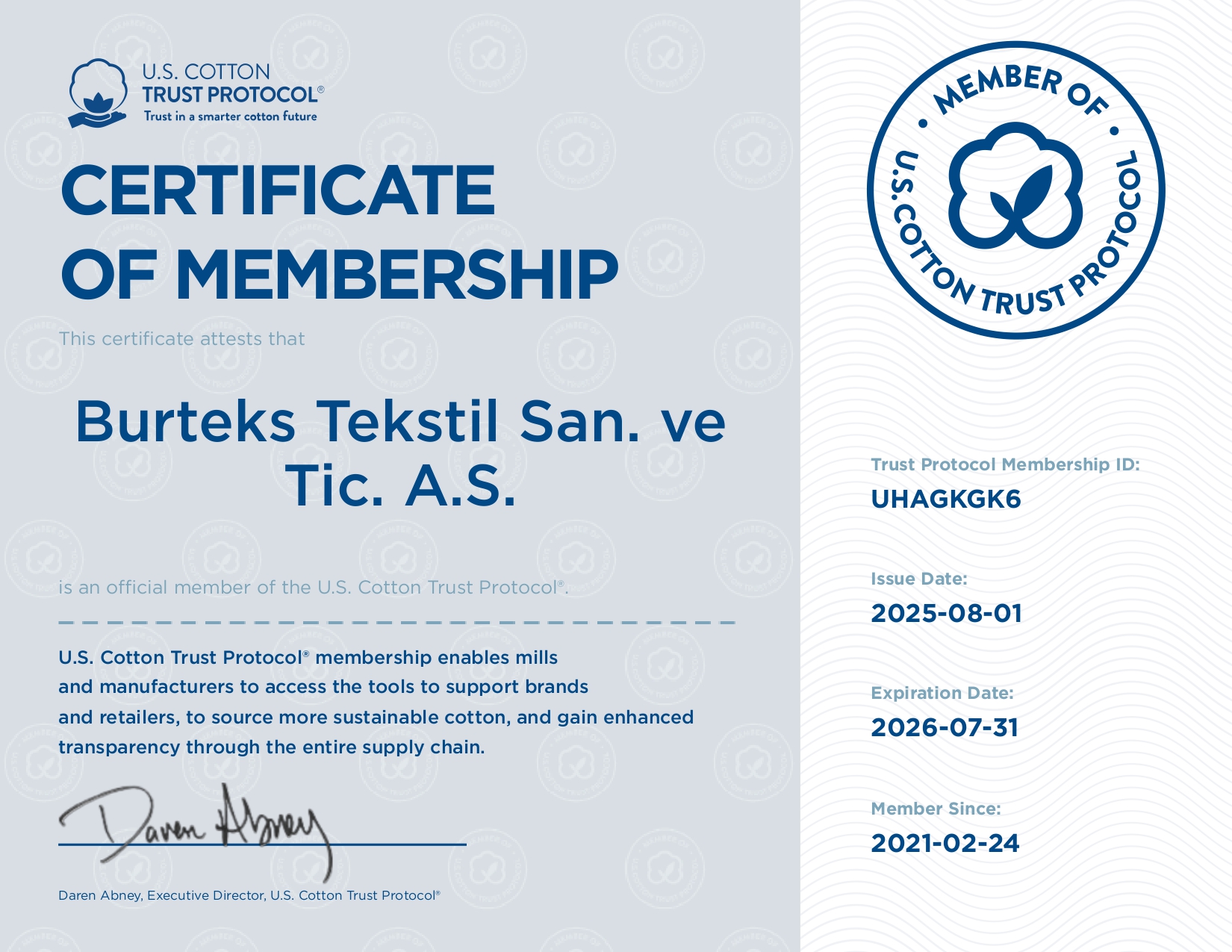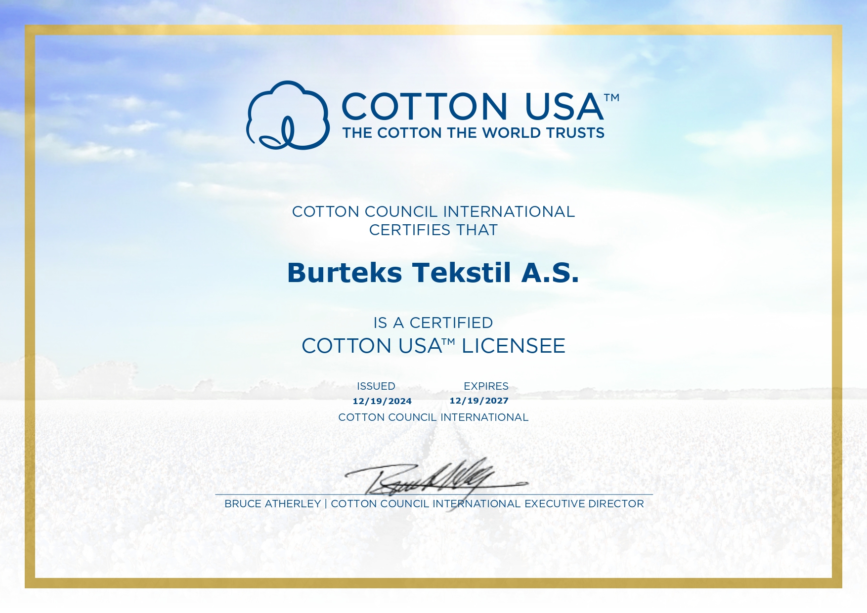 Burteks tekstil sürdürülebilirlik çalışmalarını belgelemek ve bu alandaki kararlılığını göstermek amacıyla birçok uluslararası sertifika ve standarda uyum sağlamıştır. Kalitelerini taçlandırdığı sertifikaları ile üretimlerinin çevre ve insan sağlığına duyarlı olduğunu kanıtlamaktadır.